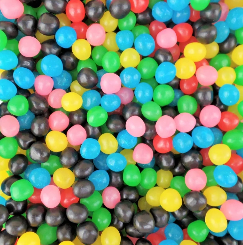 Ingrédients : sucre; sirop de glucose; amidon; acidifiants: acide citrique, acide malique; correcteurs d'acidité: citrate monosodique, malate acide de sodium; arôme; colorants: curcumine, bleu patenté V, charbon végétal, carotènes végétaux, anthocyanes; agent d'enrobage: cire de carnauba.