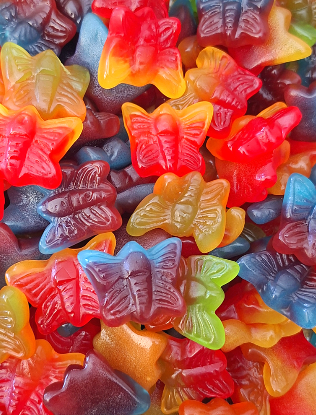 Ingrédients : Sirop de glucose, sucre, amidon de pomme de terre modifié, eau, gélatine, acidifiants : E330, E296, E270, Colorants :E102, E129,E133, , arôme, huile végétale, agent de démoulage cire de carnauba.